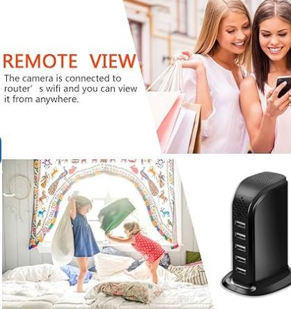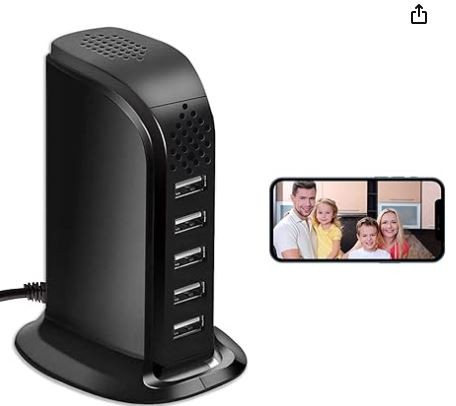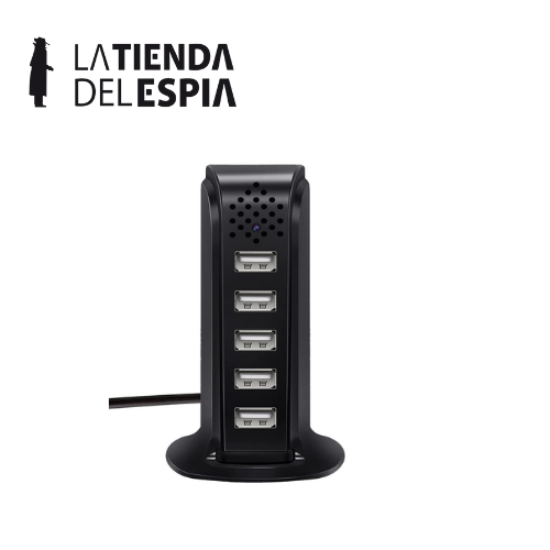 Cámara wifi USB que cuenta con 5 puertos de carga para cargar hasta 5 dispositivos a la vez. Funciona 24 horas al día 7 días a la semana sin preocuparse de la duración de la batería y se ve igual a los dispositivos en tu casa.