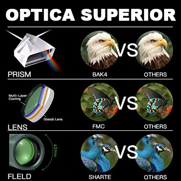 - Potente aumento 12x: Ofrece un aumento real de 12x con una lente objetivo de 42 mm, proporcionando una visión nítida y estable, especialmente útil para objetos en movimiento rápido, como aves.